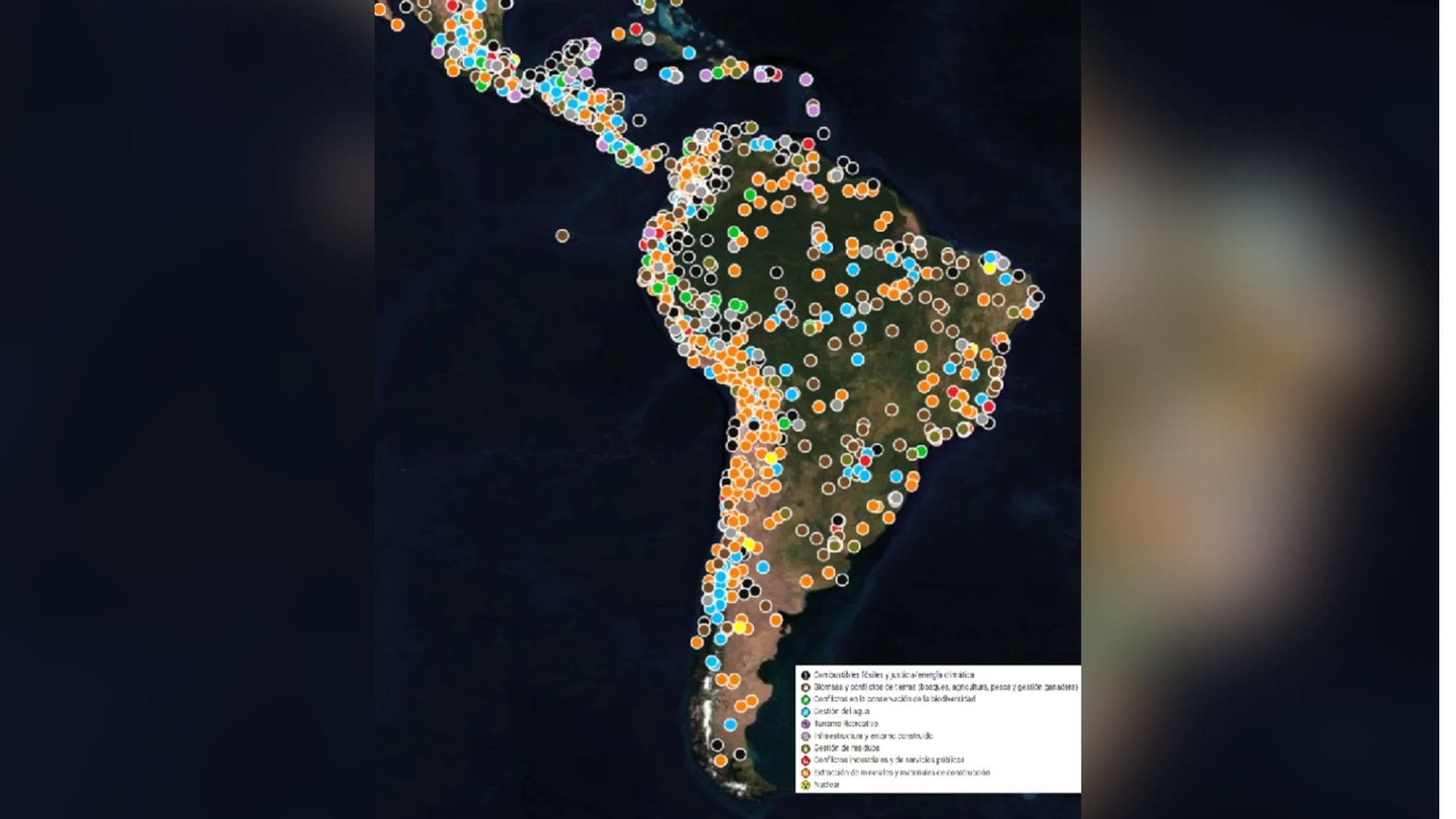 Con el objeto de tener una imagen de la localización y tipos de conflictos socioambientales en Abya Yala —estimados actualmente en 1.200 casos— se publica el mapa de Abya Yala del Atlas Global de Justicia Ambiental (Universidad Autónoma de Barcelona; ene. 2026), que indica la ubicación de conflictos. Ello visibiliza los lugares de defensa de territorios, agua, aire y modos de vida frente a proyectos que amenazan su existencia. Incluye conflictos relacionados con combustibles fósiles, extracción minera, agroindustria, pesca y explotación de bosques.
