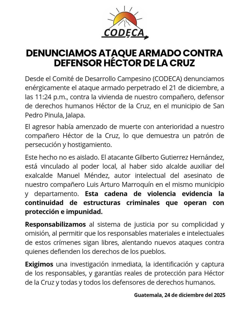 El Comité de Desarrollo Campesino (CODECA) denunció públicamente un ataque armado perpetrado contra la vivienda de Héctor de la Cruz, defensor de derechos humanos, en el municipio de San Pedro Pinula, Jalapa. El incidente ocurrió el pasado 21 de diciembre aproximadamente a las 11:24 p.m.