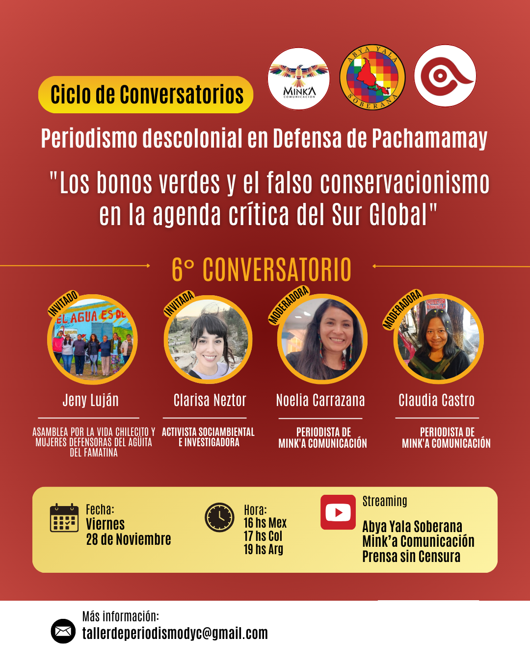 Desde el espacio Abya Yala Soberana, y por iniciativa de Amapola Periodismo Transgresor y Mink’a Comunicación, este vviernes 28 de noviembre se llevará a cabo el sexto Conversatorio “Los bonos verdes y el falso conservacionismo en la agenda crítica del Sur Global” del Ciclo de Periodismo Descolonial en Defensa de Pachamamay, a las 16 h (Centroamérica) y 19 h (Argentina), en su modalidad virtual.