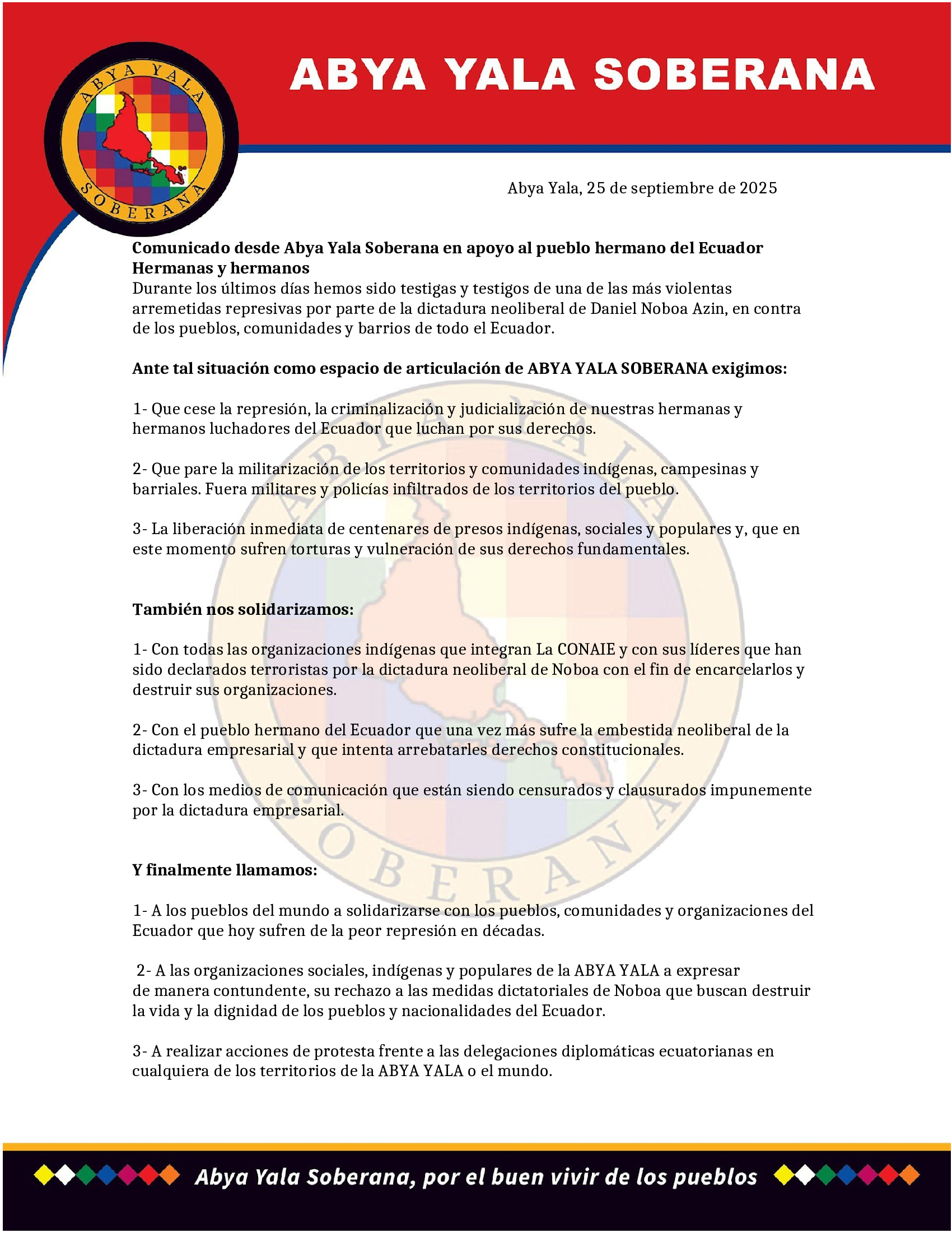 En comunicados difundidos este fin de semana, la Red de Medios Alternativos (RMA) y la articulación continental Abya Yala Soberana llamaron a pronunciarse y acompañar la lucha de los pueblos ecuatorianos, denunciando la criminalización de la protesta y la militarización de los territorios.